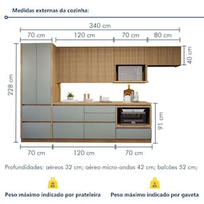 É um armário resistente? Sim, o material MDF de alta qualidade garante resistência e durabilidade. Acabamento da Prateleira: Pintura Escala de Brilho da Prateleira: Fosco Acabamento da Gaveta: Impressão Escala de Brilho da Gaveta: Fosco Acabamento da Porta: Impressão Escala de Brilho da Porta: Fosco Acabamento dos Pés: Pintura Acompanha Tampo: Sim Altura dos Pés: 10 cm Altura Máxima dos Pés: 10.0000 Ambiente Principal: Cozinha Balcão Suporta Pia: Não codigo_ean: 7900288201485 Complexidade da Montagem: Alta: deve ser montado por um montador especializado Cor: Marrom/Verde Cor do Produto: Marrom/Verde Escala de Brilho: Fosco Espessura do Tampo: 30 mm Gaveta com Chave: Não Itens Inclusos: 1 Cozinha Completa, Kit ferragem e Manual de Montagem. Linha ou Coleção: Norten Manual de Montagem e Instalação: https://product-hub-prd.madeiramadeira.com.br/748110808/documents/f127c1e5-5487-4be9-91b0-a1624cb1cff2309335673217533583749155.pdf Marca: Nesher Móveis Material da Corrediça: Metálica Material da Dobradiça/Corrediça da Porta: Metálica Material da Gaveta: MDF Material da Porta: MDF Material da Prateleira: MDF Material do Tampo: MDF Material dos Pés: MDF Medida de cada item (A x L x P): Paneleiro 2 Portas2 Gavetas 70 Cm A: 228 Cm P: 52 Cm L: 70 Cm Armário Aéreo2 Portas 120 Cm A: 80 Cm P: 32 Cm L: 120 Cm Aéreo Geladeira1 Porta Basculante. 80 Cm A: 40 Cm P: 32 Cm L: 80 Cm Balcão 1 Porta4 Gavetas 120 Cm A: 91 Cm P: 52 Cm L: 120 Cm Armário Micro-ondas1 Porta Basculante. 70 Cm A: 80 Cm P: 42 Cm L: 70 Cm Balcão Forno1 Gaveta 70 Cm A: 91 Cm P: 52 Cm L: 70 Cm modular: Sim Necessita Montagem: Sim O Balcão Acompanha Pia: Não Origem do Produto: Nacional Pés Reguláveis: Não Peso: 252,82 kg Peso Máximo por Gaveta: 5 kg Peso Máximo por Prateleira: 10 kg Possui Pés: Rodapé Possui Portas: Sim Possui Prateleiras: Sim Possui recorte para Cooktop: Não Possui Rodízio: Não Possui Vidro: Não Produto Montado: Sim Recomendações de Uso, Manutenção e Limpeza: Utilizar pano macio levemente umedecido e na sequencia pano macio seco. Sapatas Niveladoras: Não Sistema de Montagem: Parafusos. Tamanho Indicado da Pia: . Tipo de Corrediça da Gaveta: Metálica Telescópica Tipo de Dobradiça da Porta: 35 mm Tipo de Dobradiça/Corrediça da Porta: 35 mm Tipo de Puxador da Gaveta: Embutido Tipo de Puxador da Porta: Embutido Marca: Não Informado