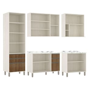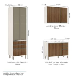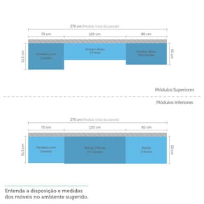 Uma cozinha modulada linda, completa, para deixar seu ambiente super aconchegante e requintado. Composta por 6 peças cuidadosamente pensadas para sua organização. Os armários aéreos são mais altos com 85cm e mais profundos com 33cm, mais espaços para acomodar e organizar. Os balcões possuem 89,5cm de altura, melhor ergonomia para maior conforto no uso diário. As portas embutidas trazem sofisticação ao ambiente, com acabamento impecável. Conta com acessórios requintados como Dobradiças Slowmotion com amortecedor incorporado para fechamento suave das portas, Puxadores tipo gola em perfil alumínio na cor inox com ponteira de acabamento para proteção contra acidentes, corrediças metálicas telescópicas em três estágios para abertura total das gavetas e pés em Poliestileno. O Paneleiro Torre contém portas com moldura em alumínio com vidros reflecta, balcões com tampos e espaço para micro-ondas, para manter tudo no lugar. Destaque para altura de 236 cm aproveitando o máximo de espeço disponível em seu ambiente. Os módulos são montados individualmente e permite a instalação da forma que melhor se adeque ao seu espaço. Para este ambiente utilizamos como proposta 270cm de parede linear.