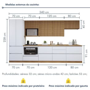 É uma cozinha resistente? Sim, o material MDF de alta qualidade garante resistência e durabilidade. Acabamento da Prateleira: Pintura Escala de Brilho da Prateleira: Fosco Acabamento da Gaveta: Impressão Escala de Brilho da Gaveta: Fosco Acabamento da Porta: Impressão Escala de Brilho da Porta: Fosco Acabamento dos Pés: Pintura Acompanha Tampo: Sim Altura dos Pés: 10 cm Altura Máxima dos Pés: 10.0000 Ambiente Principal: Cozinha Balcão Suporta Pia: Não codigo_ean: 7900288200822 Complexidade da Montagem: Alta: deve ser montado por um montador especializado Cor: Branco/Marrom Cor do Produto: Branco/Marrom Escala de Brilho: Fosco Espessura do Tampo: 30 mm Gaveta com Chave: Não Itens Inclusos: 1 Cozinha Completa, Kit Ferragens e Manual de Montagem Linha ou Coleção: Norten Manual de Montagem e Instalação: https://product-hub-prd.madeiramadeira.com.br/126041601/documents/5dd6932b-b90a-4ea1-b31e-56bedeaef102309334973217533583377642.pdf Marca: Nesher Móveis Material da Corrediça: Metálica Material da Dobradiça/Corrediça da Porta: Metálica Material da Gaveta: MDF Material da Porta: MDF Material da Prateleira: MDF Material do Tampo: MDF Material dos Pés: MDF Medida de cada item (A x L x P): Paneleiro 2 Portas 2 Gavetas 70 Cm A: 228 Cm P: 52 Cm L: 70 Cm Arm. Micro-ondas 1 Porta Basc. 70 Cm A: 80 Cm P: 42 Cm L: 70 Cm Armário Aéreo 2 Portas 120 Cm A: 80 Cm P: 32 Cm L: 120 Cm Aéreo Geladeira 1 Porta Basc. 80 Cm A: 40 Cm P: 32 Cm L: 80 Cm Balcão Forno 1 Gaveta 70 Cm A: 91 Cm P: 52 Cm L: 70 Cm Balcão 1 Porta 4 Gavetas 120 Cm A: 91 Cm P: 52 Cm L: 120 Cm Balcão 1 Porta 1 Gaveta 80 Cm A: 91 Cm P: 52 Cm L: 80 Cm modular: Sim Necessita Montagem: Sim O Balcão Acompanha Pia: Não Origem do Produto: Nacional Pés Reguláveis: Não Peso: 297,68 kg Peso Máximo por Gaveta: 5 kg Peso Máximo por Prateleira: 10 kg Possui Pés: Rodapé Possui Portas: Sim Possui Prateleiras: Sim Possui recorte para Cooktop: Não Possui Rodízio: Não Possui Vidro: Não Produto Montado: Sim Recomendações de Uso, Manutenção e Limpeza: Utilizar pano macio levemente umedecido e na sequencia pano macio seco. Sapatas Niveladoras: Não Sistema de Montagem: Parafusos. Tamanho Indicado da Pia: . Tipo de Corrediça da Gaveta: Metálica Telescópica Tipo de Dobradiça da Porta: 35 mm Tipo de Dobradiça/Corrediça da Porta: 35 mm Tipo de Puxador da Gaveta: Embutido Tipo de Puxador da Porta: Embutido Marca: Não Informado