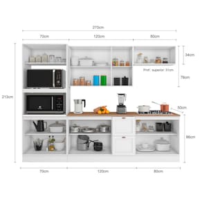 Caracter?sticas: Marca: Poliman M?veis Modelo: Olivia Portas de bater almofadadas/molduradas em MDF Balc?es com tampo de 27mm de espessura Corredi?as telesc?picas Dobradi?as de 35mm Prateleiras internas Puxadores retro em pol?mero Espa?o para forno e micro-ondas P?s PVC regul?veis 14,5cm Rodap?s remov?veis com presilhas modelo click.