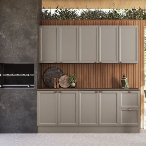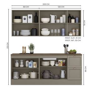 Produto com portas almofadadas/molduradas em MDF inspirada nas clássicas cozinhas americanas.Amplo espaço interno, prateleiras no aéreo triplo, duplo, balcão 1,20m e no balcão de 0,80m a prateleira é removível com espaço para acomodar objetos maiores.