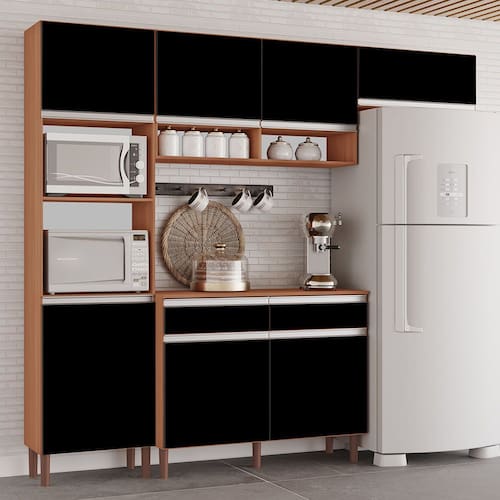 Apresentamos a Cozinha Completa Modulada Virginia New. A cozinha Virginia New oferece excelente divisão interna para otimização do espaço e organização. A pintura touch proporciona um acabamento moderno e elegante. Os puxadores em PVC são práticos e duráveis. Corrediças telescópicas e divisor de talheres garantem funcionalidade, enquanto o sistema com pistão de gás adiciona eficiência ao ambiente.Parte superior do formulário