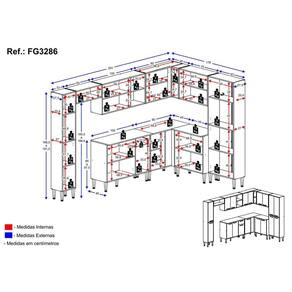 Dimensões do produto montado: Cozinha: Altura: 191 cm - Largura: 291 x 178 cm - Profundidade: 27,5 cm (aéreos e paneleiro) - 45 cm (balcão com tampo) Espaço do nicho para fogão/geladeira: Altura: 168 cm - Largura: 63 cm *Você pode consultar as medidas internas na imagem técnica do produto.