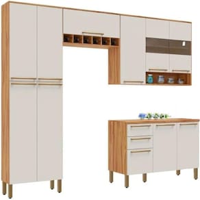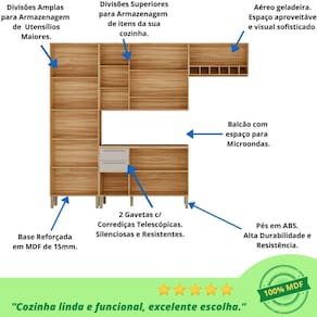A Cozinha Napoli Prime é um produto 100% MDF, o seu acabamento é em pintura U.V. e fita de bordo FF. Possui 4 peças, Aéreo Geladeira Com Adega, Aéreo Triplo, Balcão com Tampo e Paneleiro Duplo. Conta com 11 portas e 2 Gavetas com corrediças telescópicas e Pés em ABS com 17 cm altura e com Regulagem.