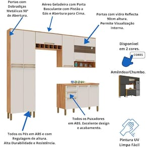 Tipo de Porta: Articulada (Balcão, Aéreo Triplo e Armário Paneleiro), Basculante com Pistão a Gás (Aéreo Geladeira)