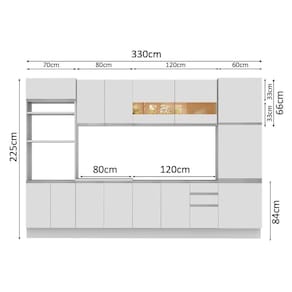 Outro diferencial são as medidas avantajadas: 225cm de altura, 330cm de largura e uma profundidade de cozinha planejada: 52cm nos balcões inferiores, torre e paneleiro e 31cm nos aéreos.