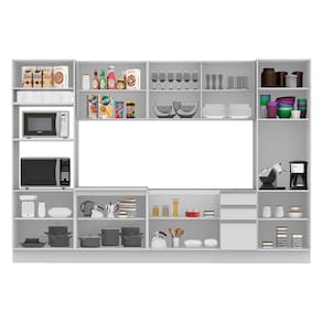 Itens inclusos: - Uma (1) coluna de 70cm com nichos para forno e micro-ondas, duas (2) portas batentes e uma (1) porta basculante - Um (1) balcão inferior de 80cm com duas portas e tampo - Um (1) aéreo de 80cm com duas (2) portas - Um (1) balcão de pia de 120cm com duas (2) portas e três (3) gavetas, sendo uma maior (não acompanha o tampo deste balcão) - Um (1) aéreo de 120cm com duas (2) portas com detalhe em vidro reflex - Um (1) paneleiro de 60cm com 3 portas