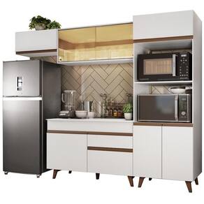 Tem espaço pra organizar tudo: panelas, louça, mantimentos, eletroportáteis e o que mais você preferir. A torre quente oferece espaço para a colocação de forno elétrico e micro-ondas.