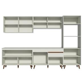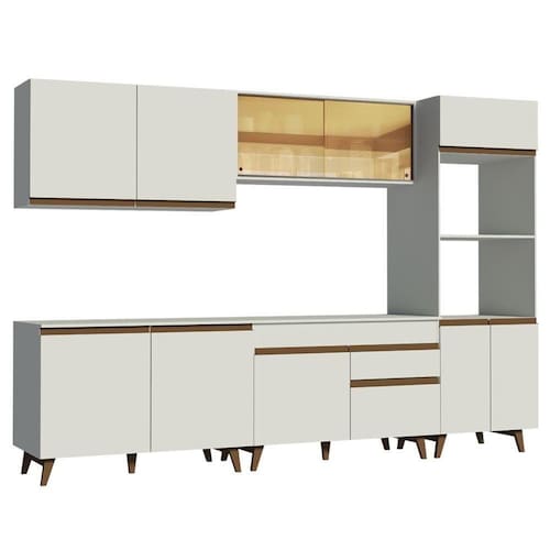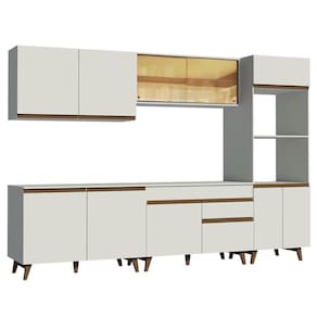 Todos os módulos são avulsos, fabricados com materiais de padrão superior, como corrediças e dobradiças metálicas. Os puxadores são embutidos, em alumínio na coloração marrom e os pés em madeira são muito bonitos e conferem firmeza e resistência ao móvel.