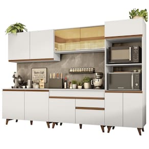 As medidas totais são: 310 cm de largura e 210 cm de altura. A profundidade é de cozinha planejada: 52 cm nos balcões e na torre e 31 cm nos aéreos.