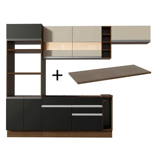- Itens inclusos: Uma (1) torre-quente com dois (2) nichos para forno e micro-ondas, um (1) nicho menor e três (3) portas sendo uma (1) basculante | Um (1) balcão de pia com duas (2) gavetas e uma (1) porta e tampo em MDP | Um (1) balcão porta panos com tampo em MDP | Um (1) aéreo com duas (2) portas com detalhe em vidro reflex | Uma (1) mini adega | Um (1) aéreo com uma (1) porta basculante