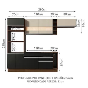 - Dimensão total do produto (AxL): 225 x 290cm | Profundidade balcões e paneleiro 52cm e aéreos 31cm