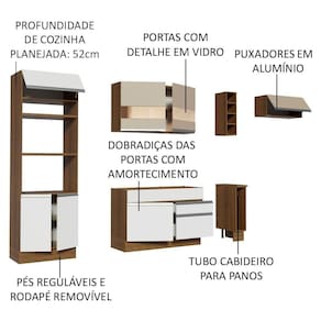 - Itens inclusos: Uma (1) torre-quente com dois (2) nichos para forno e micro-ondas, um (1) nicho menor e três (3) portas sendo uma (1) basculante | Um (1) balcão de pia com duas (2) gavetas e uma (1) porta e tampo em MDP | Um (1) balcão porta panos com tampo em MDP | Um (1) aéreo com duas (2) portas com detalhe em vidro reflex | Uma (1) mini adega | Um (1) aéreo com uma (1) porta basculante