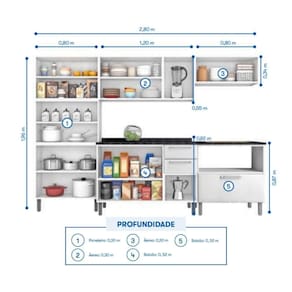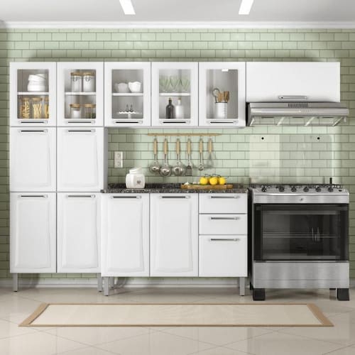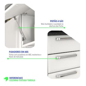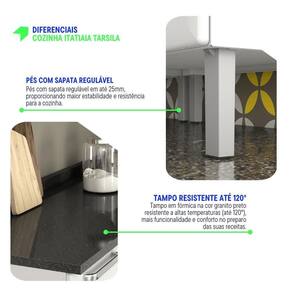 Fechamento suave com Dobradiças Slow Motion: Mais conforto e silêncio no uso das portas. Corrediças Telescópicas: Acesso completo às gavetas com deslizamento leve e eficiente. Pés com Sapata Regulável: Ajuste de até 25mm, garantindo estabilidade e em qualquer piso. Tampo Resistente a Altas Temperaturas (até 120C): Beleza e funcionalidade com tampo em fórmica ou granito que suporta altas temperaturas. Abertura suave com Pistão a Gás: Portas que se abrem de maneira fácil e suave, proporcionando maior comodidade. Puxadores em ABS: Resistentes e de fácil manuseio, complementando o design moderno e durável.