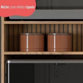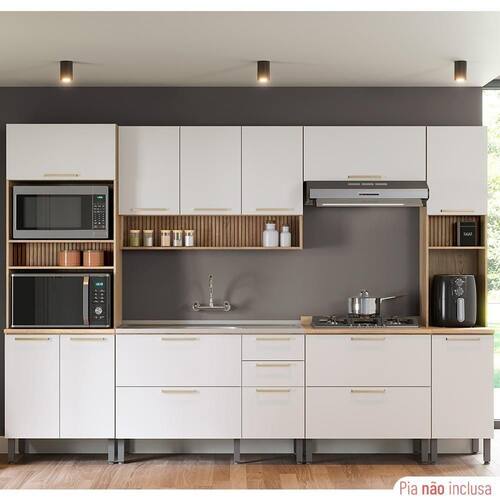 Esta Cozinha Completa da linha Avelã é a escolha perfeita para quem sempre sonhou em ter uma cozinha especial para passar momentos inesquecíveis com a família e amigos. Oferece amplo espaço para organização e armazenamento, além de um visual moderno e minimalista: inspirado no que há de mais atual em tendência de móveis. Aqui, ela é composta por 6 módulos muito funcionais, que remetem à estética visual e qualidade dos móveis planejados. Portas são equipadas com dobradiças ;com caneco de 35mm e sistema de amortecimento slow motion para garantir movimentos mais suaves na abertura e fechamento; já as portas basculantes possuem pistão a gás um componente que garante sustentação e segurança na usabilidade. As gavetas contam com corrediças telescópicas sinônimo de firmeza, deslizamento mais suave e abertura de extração total. Outro destaque são os puxadores, que além modernos na cor Gold, são de alumínio muito mais duráveis. O Paneleiro Torre Quente dispõe de espaços para forno e micro-ondas assim seus eletros ficam sempre à mão. O amplo Armário Aéreo de 1,20m é cheio de personalidade: o nicho com acabamento em estilo ripado é perfeito para acomodar aqueles itens especiais. Os Balcões são espaçosos, equipados com duas gavetas e divisor de talheres. Uma cozinha ao estilo do planejado, mas pronta para a sua casa!