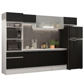 O acabamento da estrutura da cozinha é branco e as portas e a frente da gaveta são pretas. É feito em Poliéster Protetor ecológico, que consiste na aplicação de 7 camadas resistentes a álcool, água e calor.