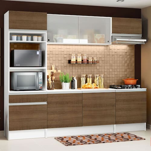 A Cozinha Completa Topazio é uma cozinha pensada nos mínimos detalhes. A cozinha possui estrutura na coloração branca e as portas e a frente da gaveta em amadeirado Rustic. Muito atual, combina com ambientes modernos, vintage/retro ou coloridos. Seu aéreo em vidro agrega beleza e sofisticação.
