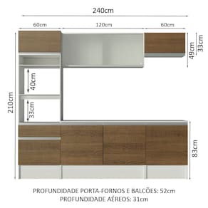 As medidas totais são: 240 cm de largura e 210 cm de altura; profundidades de 31 cm nos aéreos e 52 cm nos balcões e paneleiro.