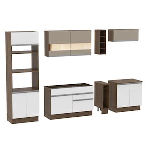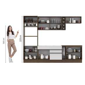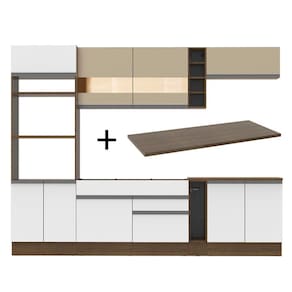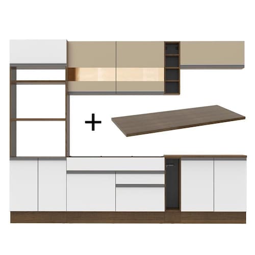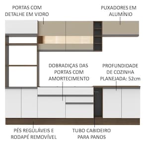 - Itens inclusos: Um (1) porta fornos com dois (2) nichos para forno e micro-ondas e três (3) portas sendo uma (1) basculante; Um (1) balcão de pia com duas (2) gavetas e uma (1) porta e tampo em MDP; Um (1) porta panos; Um (1) balcão com duas (2) portas e tampo em MDP; Um (1) aéreo com duas (2) portas com detalhe em vidro reflex; Um (1) aéreo com uma (1) porta basculante; Uma (1) mini adega