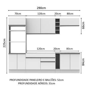 - Profundidade: Balcões e paneleiro 52cm | Aéreos 31cm