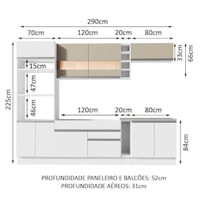 - Profundidade: Balcões e paneleiro 52cm | Aéreos 31cm