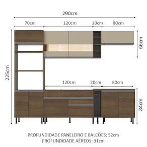 - Dimensão total do produto (AxL): 225 x 290cm | Profundidade balcões e paneleiro 52cm e aéreos 31cm