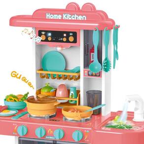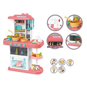 Simula ás crianças cozinhado, e a interação entre pais e filhos na cozinha. Música leve e luzes. Água disponível, simulação de cozinhar, desenvolvimento e interesse em cozinha para as crianças. Escrever o cardápio do dia no quadro. A pia pode fornecer água de verdade, veja a alegria do trabalho na cozinha onde as crianças poderão realmente se divertir e aprender. Várias formas para abrir as portas. Uso de gabinetes e espaços para guardar os acessórios. Brincar de cozinha com as crianças será muito divertido.