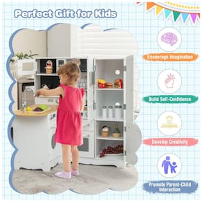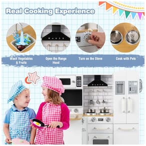 Playset de cozinha 11 em 1 Este conjunto de cozinha de canto infantil é uma miniatura de uma cozinha real em sua casa. É composto por máquina de lavar roupa, exaustor, fogão, forno, micro ondas, bebedouro, frigorifico lateral, lava loiças e torneira, fogão de indução e telefone. Esses aparelhos sofisticados levam as crianças a um maravilhoso mundo de jogo enquanto desenvolvem sua capacidade cognitiva, habilidade prática e habilidades sociais. Som vívido Para adicionar diversão sem fim ao jogo de RPG do chef, o botão do fogão emitirá um som de clique ao girá lo. Acessórios completos e amplo espaço de zenamento O jogo de fingir chef vem com uma gama completa de acessórios de cozinha, incluindo 3 utensílios de cozinha, 1 panela com tampa, 1 panela. Enquanto isso, existem muitos armários de zenamento e 3 ganchos para pendurar para ajudar as crianças a guardar os utensílios de cozinha em ordem. Material durável e design Feito de MDF premium com conexão firme, este jogo de cozinha simulado garante excelente estabilidade e durabilidade. Pensando na segurança das crianças, todo o conjunto de brinquedos é projetado com cantos arredondados e bordas sem rebarbas. Montagem fácil e tamanho perfeito Forneceremos peças rotuladas, instruções ilustradas e um vídeo de montagem correspondente, para que você possa concluir a instalação facilmente. A dimensão deste conjunto de brinquedos é de 82 x 66 x 84 centímetros, o que é perfeito para meninos e meninas com mais de 3 anos. Presente ideal para crianças Este conjunto de jogos de cozinha oferece inúmeras oportunidades para brincadeiras interativas e imaginativas. Duas crianças pequenas podem cozinhar juntas para cooperar e compartilhar a felicidade. É um presente ideal para o aniversário dos seus filhos, Natal Eles vão adorar brincar com seus amigos e se tornar mais ativos Marca: Não Informado
