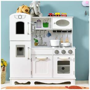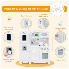 APARÊNCIA REALISTA A cozinha realista para crianças brincam proporcionará ao seu filho uma experiência de culinária autêntica, que apresenta fogão, pia, geladeira, relógio e botões com som. O dispensador de água é projetado com efeitos de luz e som, que simulam realisticamente a água de vazamento. Além disso, este conjunto de brinquedos de cozinha pode evitar os perigos de cozinhas reais. ESPAÇO GRANDE PARA ZENAMENTO Vários armários ajudam a eliminar problemas de zenamento para manter a sala arrumada. Armários com portas e gaveta podem oferecer amplo espaço para zenar brinquedos sem poeira. Além disso, 2 armários com acrílico podem aumentar a visibilidade. Enquanto isso, existem 2 prateleiras abertas para facilitar o acesso a itens s com frequência. QUADRO MATERIAL E ESTÁVEL Para garantir sua segurança, o MDF e o PP selecionados passaram na certificação ASTM, de modo que o brinquedo de comida de cozinha fingido para esse garoto é absolutamente de usar. Comparado com uma cozinha infantil de plástico, este conjunto de brinquedos de cozinha apresenta uma estrutura mais estável e fornece um serviço mais longo. BRINQUEDO DE COZINHA EDUCACIONAL Este conjunto de brinquedos de cozinha cuidadosamente criado é uma boa maneira de seus filhos aprenderem sobre culinária e reconhecimento de tempo através de divertidos jogos de interpretação de papéis. O conjunto de cozinha permite que seus filhos compartilhem e brinquem com os amigos, aumentando assim a criatividade enquanto desenvolvem a interação social. ACESSÓRIOS COMPLETOS DE COZINHA Este conjunto de brinquedos de cozinha de madeira para crianças vem com vários acessórios, incluindo uma panela com tampa, uma panela, 3 utensílios de cozinha e um telefone vintage, portanto, seus filhos podem mergulhar na alegria de cozinhar por um longo tempo. Além disso, o manual do usuário fornece instruções de instalação claras para evitar perder muito tempo.