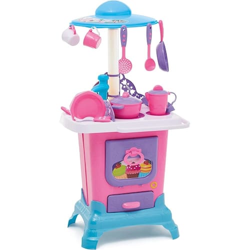 Cheia de estilo e funcionalidades a cozinha do castelo dá asas a imaginação das crianças. Permitindo que elas criem, simulem e reproduzam situações do dia a dia. O charme da cozinha fica por conta do fogão superior com peças de encaixe, como em um fogão a lenha de verdade! Outro detalhe é a coifa multiuso, nela é possível pendurar os utensílios da cozinha. E para completar a brincadeira, a cozinha acompanha vários acessórios, como pratos, xícaras, talheres, panela, leiteira com tampa, além de possuir a pia com torneira que sai água de verdade, conta ainda com mais um forno na parte inferior, com gaveta.