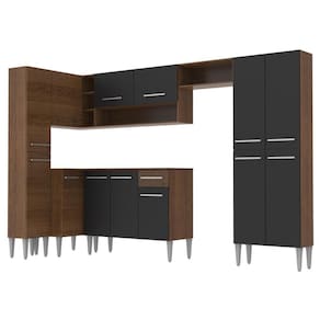 - Seis módulos independentes: paneleiro com duas portas; balcão de canto reto; armário aéreo de canto reto com duas portas e adega; balcão de pia; armário aéreo com duas portas e dois nichos; paneleiro duplo com quatro portas.