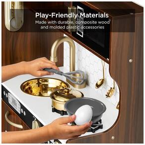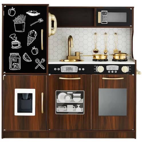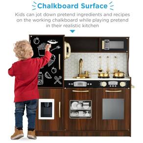 Este grande conjunto de cozinha infantil é perfeito para pequenos chefs que querem se divertir enquanto fingem cozinhar. Com um design realista que imita uma cozinha real, a superfície do quadro negro incluída permite que as crianças façam anotações enquanto brincam. O conjunto vem com 11 acessórios, incluindo utensílios, panelas, uma tampa para brincar e até uma máquina de fazer gelo que dispensa 4 cubos de gelo. Com sons realistas e recursos divertidos, como toalheiro e máquina de gelo, as crianças podem ter uma experiência verdadeira enquanto brincam. A cozinha também possui backsplash para um apelo moderno. Montar o item pode levar cerca de 90 minutos, seguindo atentamente o manual de instruções incluído. O conjunto é feito com materiais plásticos seguros e atende aos padrões de segurança federais dos EUA para ASTM CPSIA. As dimensões gerais são de 79,38 cm x 24,13 cm x 80,01 cm.