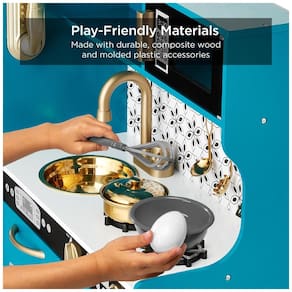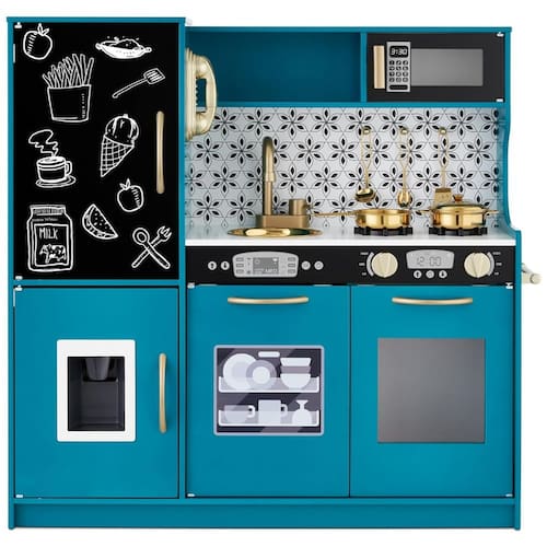 Este grande conjunto de cozinha infantil é perfeito para pequenos chefs que querem se divertir enquanto fingem cozinhar. Com um design realista que imita uma cozinha real, a superfície do quadro negro incluída permite que as crianças façam anotações enquanto brincam. O conjunto vem com 11 acessórios, incluindo utensílios, panelas, uma tampa para brincar e até uma máquina de fazer gelo que dispensa 4 cubos de gelo. Com sons realistas e recursos divertidos, como toalheiro e máquina de gelo, as crianças podem ter uma experiência verdadeira enquanto brincam. A cozinha também possui backsplash para um apelo moderno. Montar o item pode levar cerca de 90 minutos, seguindo atentamente o manual de instruções incluído. O conjunto é feito com materiais plásticos seguros e atende aos padrões de segurança federais dos EUA para ASTM CPSIA. As dimensões gerais são de 79,38 cm x 24,13 cm x 80,01 cm.