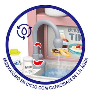 Essa bancada é incrível! A começar pelo tamanho, com 98 cm de altura e 108 cm de largura. Possui reservatório com capacidade de 1,5lt de água para lavar toda a louça. Simula fumaça e barulho de fritura enquanto cozinha, possui um cooktop com multifunção que fala durante o preparo e toca música (inglês), tem uma bancada de apoio e conta também, com diversos compartimentos e acessórios para as mais incríveis brincadeiras de faz de conta.