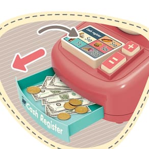 - Com uma caixa registradora e dinheiro de mentirinha para o atendimento