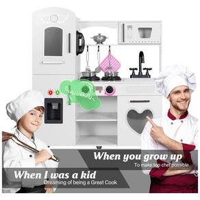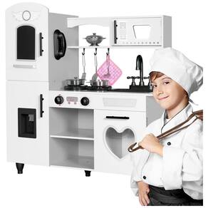 Nossa cozinha interativa para crianças é um brinquedo completo, com elementos que incluem um dispensador alimentado por bateria, um forno de micro ondas e um botão de clique com botões e sons. A estrutura é feita de madeira composta resistente e peças de plástico moldadas, garantindo segurança máxima e a capacidade de suportar anos de desgaste. A cozinha de simulação pode ser montada de forma rápida e fácil, incluindo todas as ferragens e instruções necessárias. O conjunto inclui 7 utensílios, uma escumadeira, uma espátula, uma concha, um escorredor, uma panela, uma panela de sopa, uma toalha isolada e um telefone sem fio, permitindo que as crianças mergulhem em uma aventura imaginativa de culinária. Além disso, a cozinha inclui um forno e prateleira para as crianças guardarem acessórios e outros brinquedos extras que queiram levar para a cozinha. A pequena e leve cozinha lúdica branca pode ser facilmente movida e operada, pesando menos de 18,14 quilos. É ideal para salas de jogos, quartos, creches e salas de aula, com prateleiras e armários embutidos para guardar acessórios.