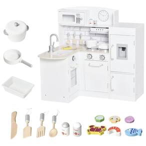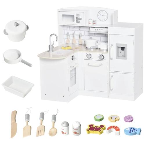 Este conjunto de cozinha infantil em formato de canto é completo com 14 acessórios, incluindo faca, garfo, colheres, panelas, frascos de tempero e alimentos como caranguejo, cebola, cogumelo, camarão, peixe e brócolis. A cozinha e a geladeira são removíveis para serem colocadas em qualquer lugar. O design da cozinha imita uma cozinha real, com pia que pode armazenar água e armário com porta que pode ser aberta e equipado com um dispensador eletrônico de água, proporcionando uma experiência realista e divertida para as crianças. Além disso, este brinquedo de cozinha é educacional, permitindo que as crianças desenvolvam habilidades como coordenação olho mão e criatividade. Feito de pinho e placa de MDF nível P2, é seguro para crianças acima de 3 anos. As dimensões gerais da cozinha infantil são 85,72 cm x 64,14 cm x 84,45 cm.