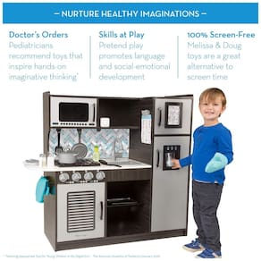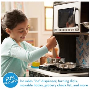 Esta cozinha de brinquedo é feita com mármore branco e madeira colorida, trazendo um toque moderno para a brincadeira. É espaçosa o suficiente para várias crianças brincarem ao mesmo tempo e inclui forno, fogão, micro ondas, pia, geladeira com dispensador de gelo funcional, freezer e amplo espaço de armazenamento para fácil limpeza. Além disso, possui uma inovadora máquina de fazer gelo que dispensa dois cubos de gelo incluídos, mostradores virar, girar pratos de micro ondas, lista de verificação de compras, ganchos móveis e portas que abrem e fecham. É perfeita para conjuntos de jogos de acessórios de cozinha, coleções de comida de mentirinha e produtos de despensa de brincar. Este brinquedo é um ótimo presente para crianças a partir de 3 anos, e você pode completar a experiência culinária de faz de conta adicionando o conjunto de acessórios de cozinha Melissa Doug.