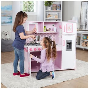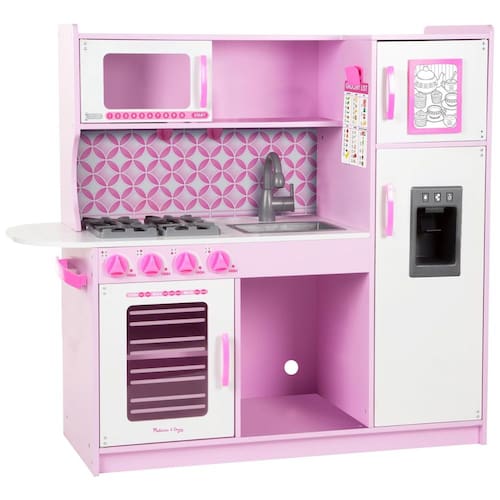 Esta cozinha de brinquedo é feita com mármore branco e madeira colorida, trazendo um toque moderno para a brincadeira. É espaçosa o suficiente para várias crianças brincarem ao mesmo tempo e inclui forno, fogão, micro ondas, pia, geladeira com dispensador de gelo funcional, freezer e amplo espaço de armazenamento para fácil limpeza. Além disso, possui uma inovadora máquina de fazer gelo que dispensa dois cubos de gelo incluídos, mostradores virar, girar pratos de micro ondas, lista de verificação de compras, ganchos móveis e portas que abrem e fecham. É perfeita para conjuntos de jogos de acessórios de cozinha, coleções de comida de mentirinha e produtos de despensa de brincar. Este brinquedo é um ótimo presente para crianças a partir de 3 anos, e você pode completar a experiência culinária de faz de conta adicionando o conjunto de acessórios de cozinha Melissa Doug.