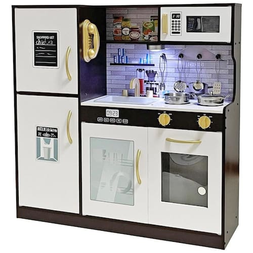 Este conjunto de cozinha interativo é perfeito para crianças que querem brincar de cozinhar como adultos. Com um design realista, o fogão possui 2 queimadores com botões de clique ativos, permitindo que a criança exercite habilidades motoras finas, raciocínio lógico e melhore habilidades linguísticas e sociais durante os jogos. A cozinha vem em um design extenso e é fácil de montar com todas as instruções incluídas na embalagem exclusiva para garantir a entrega segura em sua casa. Totalmente equipada, as portas do forno, armário, congelador, frigorífico e micro ondas abrem e fecham, tornando a brincadeira mais animada e interessante com uma variedade de utensílios de cozinha realistas. A cozinha infantil tem espaço de armazenamento suficiente para cultivar a capacidade de armazenamento das crianças e desenvolver um bom hábito de arrumar as coisas. É grande o suficiente para que várias crianças possam brincar ao mesmo tempo, desenvolvendo seus interesses e hobbies, exercitando habilidades práticas e melhorando a expressão da linguagem e as habilidades sociais no jogo. A cozinha lúdica é ideal para aulas de RPG criativas e é um presente perfeito para crianças. A superfície reforçada anti riscos evita danos causados por unhas finas ou contatos com outros objetos, eliminando a possibilidade de crianças comerem a tinta. A cozinha foi construída para durar e não se desgastará tão cedo. Os brinquedos de cozinha vêm com instruções de montagem e é necessário preparar uma chave de fenda. em caso de falta de peças ou problemas de instalação.