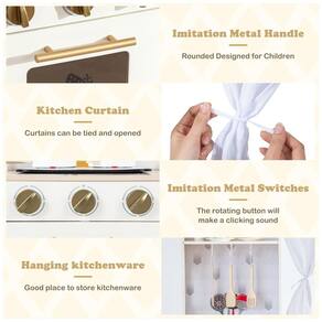 A montagem é fácil e rápida, com instruções detalhadas inclusas. A pia pode ser facilmente removida para limpeza e os eletrodomésticos têm superfícies lisas, o que torna a limpeza ainda mais fácil. Além disso, este conjunto de cozinha infantil permite que as crianças compartilhem a alegria de explorar a cozinha com seus colegas, desempenhando papéis, promovendo a aprendizagem da criatividade e exercitando habilidades práticas.