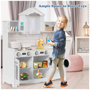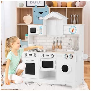 Este conjunto de cozinha infantil Costzon oferece uma experiência culinária realista para as crianças, permitindo que elas brinquem na cozinha enquanto os adultos cozinham em outra. Com eletrodomésticos de mentira, incluindo um botão clicável do fogão, geladeira, micro ondas e máquina de lavar, as crianças podem cozinhar ingredientes de mentira e fingir lavar a louça depois do jantar com a torneira e pia removível. O conjunto também possui grande espaço de armazenamento, com portas que abrem para armazenar alimentos e utensílios de cozinha. Construído em MDF sólido e com tinta adequada para crianças e inodora, este conjunto é durável e seguro para que as crianças possam brincar livremente. Certificado pela ASTM e CPSIA, é perfeito para sala de jogos, quarto, creche ou sala de aula. Este conjunto de jogos de cozinha é um presente ideal para as crianças, proporcionando inúmeras oportunidades para brincadeiras interativas e imaginativas, permitindo que duas crianças cozinhem juntas para cooperar e compartilhar a felicidade.