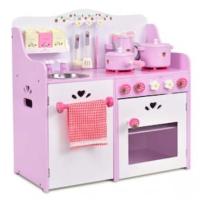 Este é um lindo conjunto de cozinha com tema de morango rosa, perfeito para crianças que adoram brincar de cozinhar. Feito com madeira maciça de pinho e MDF, é durável e estável para suportar anos de uso. A tinta utilizada é adequada para crianças e inodora. São 13 acessórios incluídos, como utensílios de cozinha, potes de tempero, panelas, chaleira, pia e toalha, feitos em madeira maciça de alto acabamento, permitindo que as crianças mergulhem em uma aventura gastronômica imaginativa.