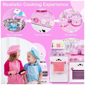 O conjunto oferece uma experiência de cozinha realista, com eletrodomésticos de mentira, botão clicável do fogão e forno para cozinhar ingredientes de mentira, torneira, pia removível, toalheiro, toalha e outros gadgets. Possui ainda grande espaço de armazenamento, com porta embaixo da pia e espaço no forno para guardar alimentos ou utensílios de cozinha.