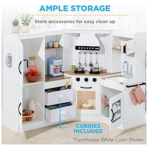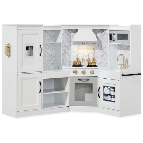 Este conjunto de jogos de cozinha é perfeito para as aventuras imaginativas de seus filhos. Com elementos interativos como um forno, pia, exaustor iluminado por bateria e máquina de fazer gelo correspondente, seu filho pode fingir que está cozinhando e assando em um espaço de recreação durável e confiável feito de MDF e metal. O fogão e o capuz têm pequenos detalhes que dão vida ao conjunto, como botões que clicam quando girados e queimadores que acendem automaticamente quando a panela e a panela incluídas são colocadas em cima. O armazenamento aberto na geladeira, despensa, forno e prateleiras da pia oferece amplo espaço para os acessórios de brincar favoritos do seu filho. As dimensões gerais do conjunto são 144,78 cm x 60,96 cm x 95,25 cm e a montagem requer atenção aos detalhes seguindo o manual de instruções incluído.