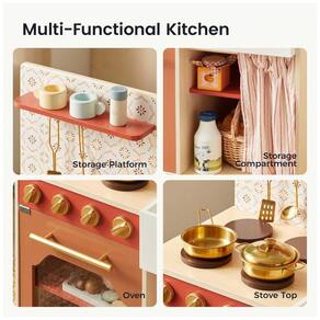Este conjunto de cozinha infantil é perfeito para crianças que sonham em ser chefes de cozinha. Com cores brilhantes e aparência natural de madeira, este conjunto vem com divertidos conjuntos de corte de alimentos e todos os acessórios necessários, como panela e frigideira, espátulas e colher. Feito de madeira lisa, resistente e durável, é seguro para crianças. É fácil de montar, com instruções detalhadas e um vídeo, e tem tamanho perfeito para espaços pequenos. As crianças podem se divertir sendo um pequeno chef, constantemente ocupado com o Toy Kitchen Set e saboreando a comida deliciosa das crianças. Brincadeiras independentes ou a participação de vários filhos e pais podem promover a imaginação e as relações sociais e entre pais e filhos. Além disso, este conjunto pode promover habilidades sociais e de comunicação, exercitar a capacidade operacional, o pensamento cerebral e a aprendizagem cognitiva em jogos.