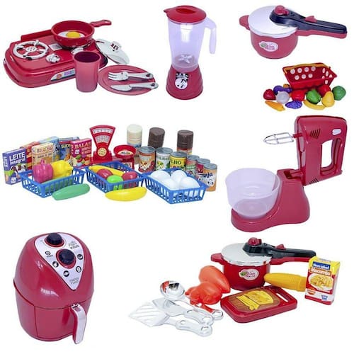 Cozinha infantil menino vermelho mercado eletro fruta 63pç Produto em estoque O kit vem com mercadinho completo, kit panelinha de pressão, kit fogão cooktop, air fryer, liquidificador, panelinha de pressão, batedeira, cestinha com frutas e legumes