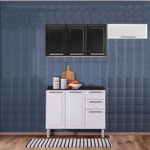 Kit Balcão Branco c/ Armário Aéreo 3 Portas Preto e 1 Armário Aéreo 1 Porta Horizontal Branco