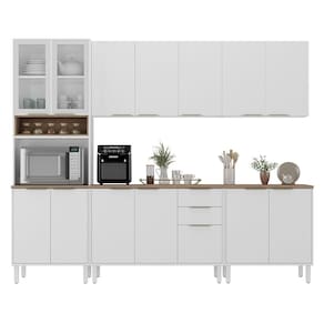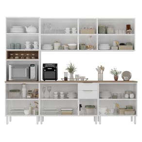 Composta por 5 peças, a cozinha inclui duas portas de vidro, que trazem leveza e sofisticação ao ambiente, além de facilitar a visualização dos itens armazenados. O paneleiro conta com um espaço dedicado especialmente para o forno, otimizando o uso do espaço e proporcionando uma solução inteligente para quem deseja mais funcionalidade.