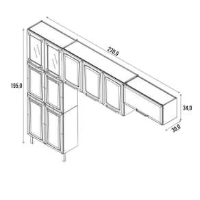 Dimensões do produto montado: Altura 1,95 | Largura 2,70 | Profundidade: paneleiro 0,30 ? armário aéreo 3 portas 0,30 ? armário aéreo 1 porta 0,30 - balcão 0,52